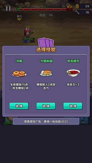 战斗采用回合制,自动挂机操作,轻松的玩法解放了玩家的双手,每完成一关后,玩家可以从技能栏中选择一项技能来进行下一关的挑战,技能效果会叠加,合理搭配是关键!